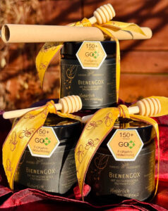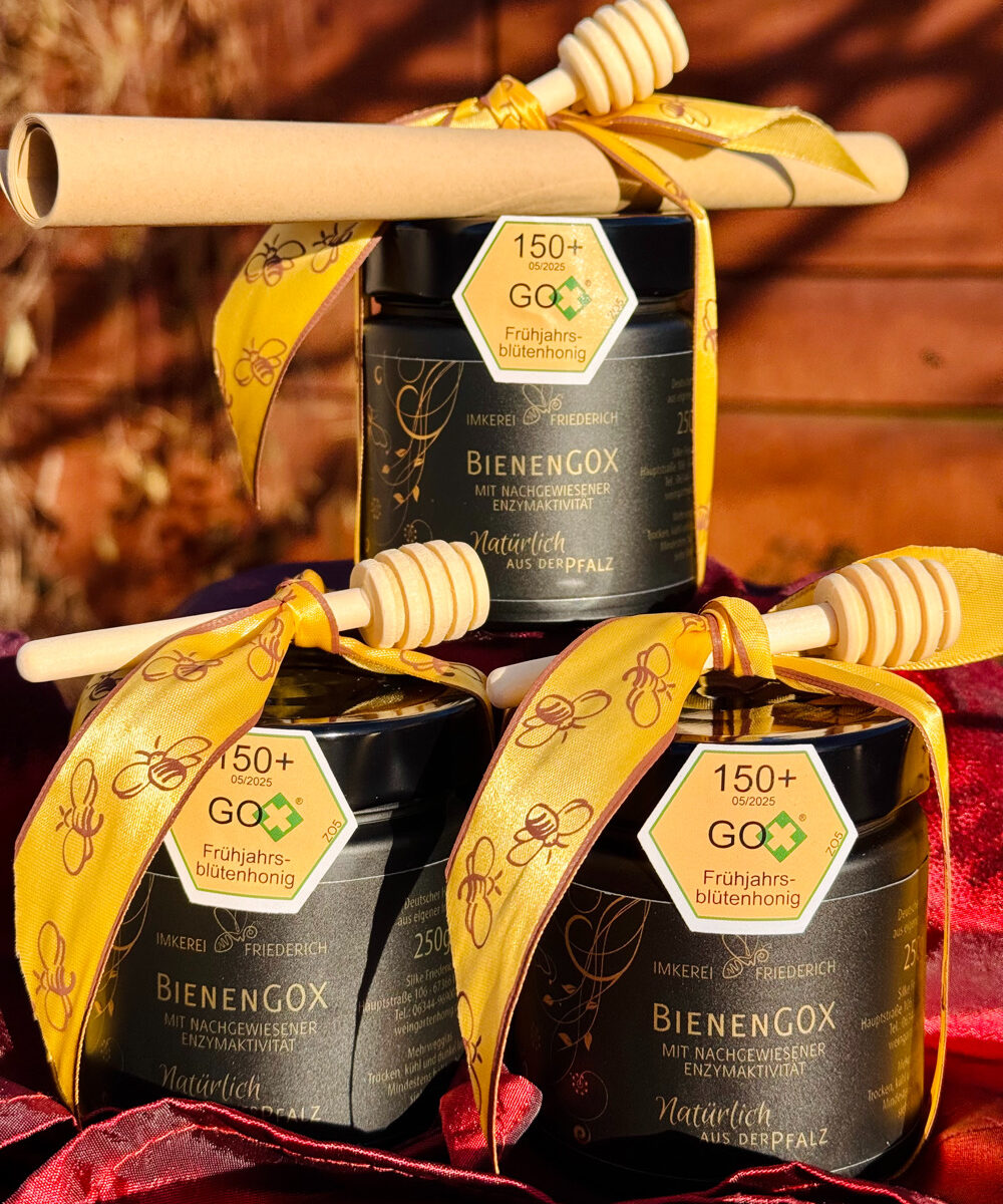 GOX steht für Glucoseoxidase, ein Enzym, das die Bienen dem Nektar beim Sammeln hinzufügen. Dieses Enzym ist der Schlüssel zur antibakteriellen Wirkung von Honig: