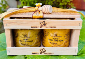 Wir haben uns für diese außergewöhnliche Zubereitung „HONIG TRIFFT SANDDORN“ für eine Sanddorn- Wildsammlung in Bio-Qualität entschieden. Diese Mischung ist etwas milder in der Fruchtsäuregestaltung zusammen mit der Süße des Honigs. Eine harmonisch ausbalancierte Kombination aus Frucht und Süße!