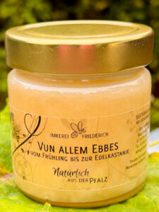 Geschmacklich hebt sich der Honig “Vun Allem Ebbes” von den anderen Honigsorten doch recht ab. Er ist cremig wie ein Frühlingsblütenhonig und schmeckt fein fruchtig aber nicht allzu süß!