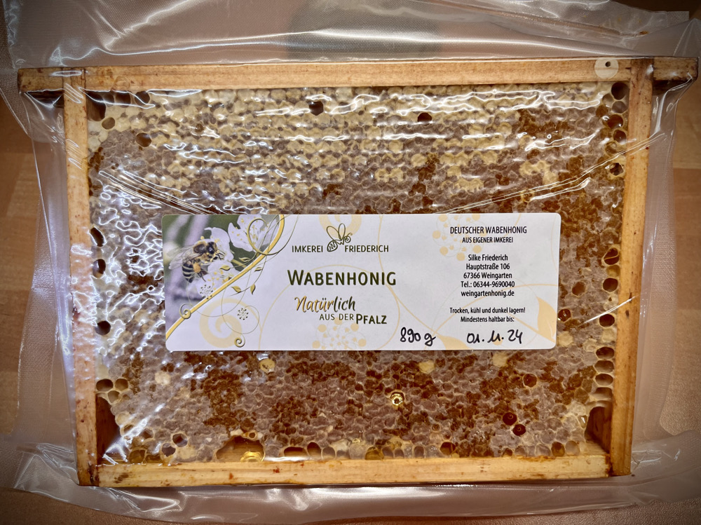Wabenhonig ist ein reiner naturbelassener Honig, der, so wie ihn die Bienen fertiggestellt haben, zum Verzehr aus dem Bienenstock entnommen wird. Wabenhonig ist mittlerweile zu einer Delikatesse des besonderen Genusses aufgestiegen. Die im Wachs enthaltenen Inhaltstoffe wie wertvolle Enzyme und Fermente werden während des Kauens aus dem Wachs freigesetzt. Da die Bienen während der Herstellung von Wabenhonig Propolis hinzufügen, findet der Wabenhonig auch in der Apitherapie seine Beliebtheit zur Linderung bei Erkältungskrankheiten. Die im Honig enthaltenen Inhibine, wie Flavonoide und Wasserstoffperoxyd, können ebenso dazu beitragen, Keime in ihrem Wachstum zu hemmen. Es wurden bis zu 30 verschiedene Zuckerarten und knapp 200 Begleitstoffe nachgewiesen. Neben Trauben- und Fruchtzucker enthält Wabenhonig auch Vitamine, Eisen, Magnesium, Fermente, Kalzium, organische Säuren, Phosphor, Natrium und Kupfer.