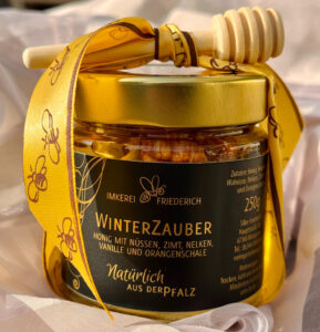 Du bekommst von uns ein 500g Glas WinterZauber in einem weinroten Samtbeutel mit Honiglöffel und einer kleiner Kugel (Farbe kann variieren) oder ein 250g Glas, dass Du selbst noch hübsch verpacken kannst oder von uns mit Honiglöffel und Stoffband.