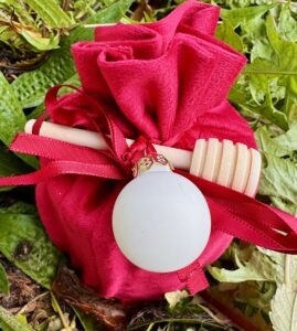 Du bekommst von uns ein 500g Glas WinterZauber in einem weinroten Samtbeutel mit Honiglöffel und kleiner Kugel (Farbe kann variieren)